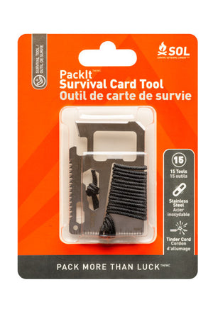 Pack fifteen tools in your pocket with the SOL PackIt Survival Card Tool. This multi-purpose tool is lightweight, durable, and fits in a wallet or pocket. Made of stainless steel, this tool will come in handy in any situation you face in the backcountry or at home.